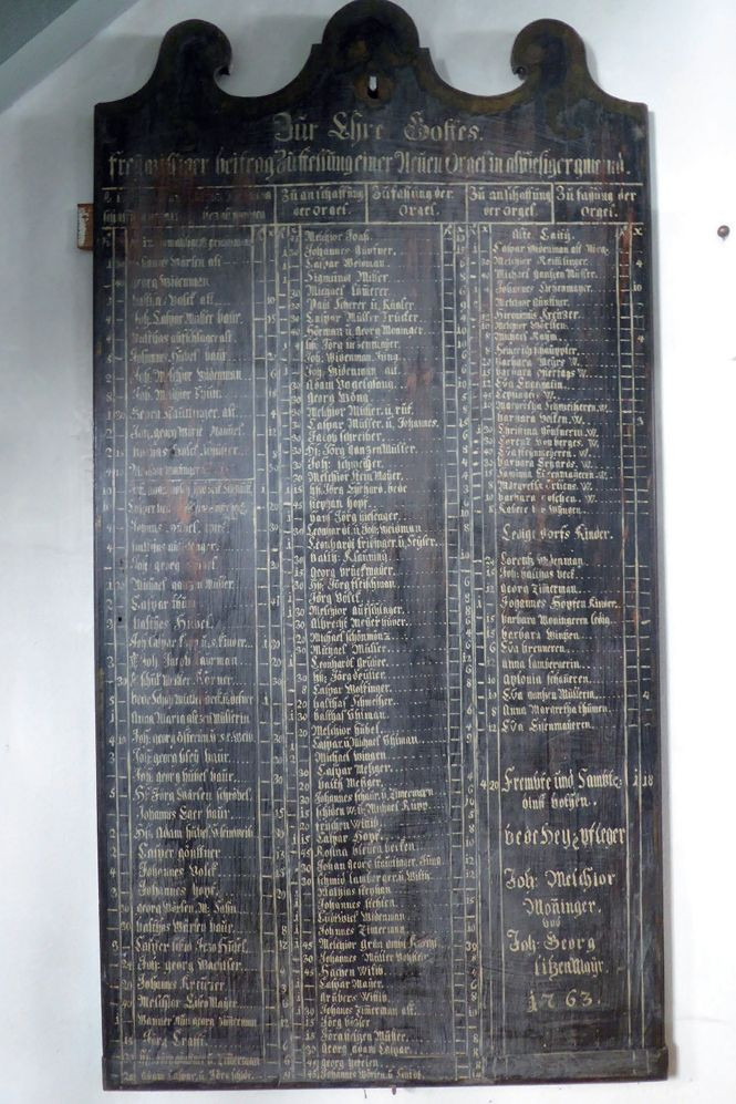 Eine Erinnerungstafel an die zahlreichen Spender und deren Spende „Zur Ehre Gottes „freiwilliger beitrag Zustellung einer Neuen Orgel alhíesiger Gemeind“ auf der linken Seite am Südausgang der Kirche weist auf die erste Orgel (1763), ein Werk der Wasseralfinger Orgelbaufirma Algeyer hin. Das schlichte Orgelgehäuse mit Oettinger Wappen ist vom Wallersteiner Maler Johann Balthasar Boos farblich gestaltet worden. Die Firma Steinmeyer, Oettingen, hatte ein neues Werk mit zwei Manualen, Pedal und zehn klingenden Registern im Jahre 1943 eingebaut. Der Spielbetrieb geschieht pneumatisch.